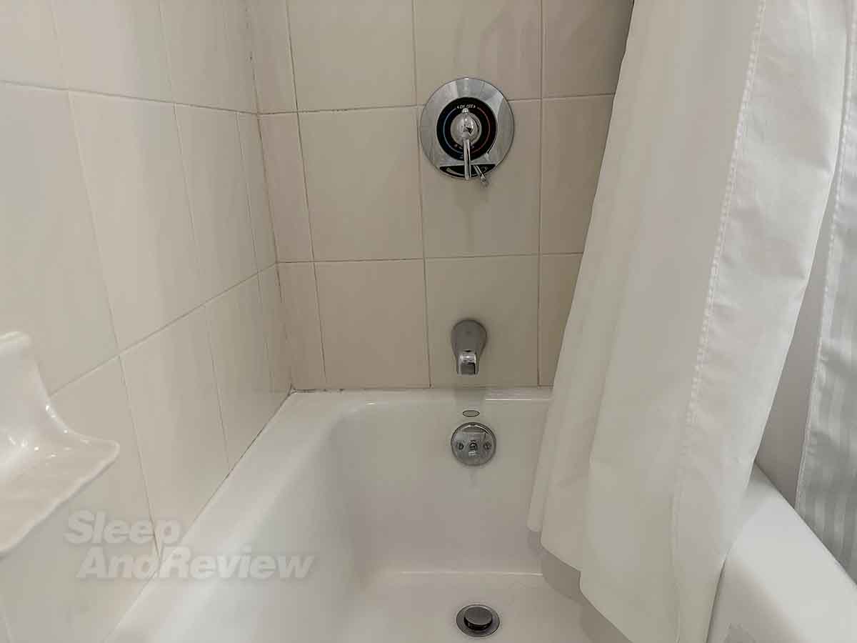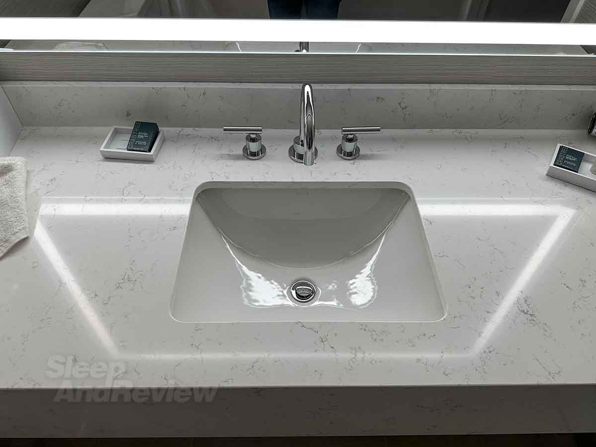 I have only three words to describe the bathroom: “Hilton” and “airport hotel.” Basically, if you’ve ever stayed in any other Hilton airport hotel anywhere in the world (except the Frankfurt Airport Hilton – that was nice), the bathrooms will be of no surprise. They’re functional, sterile, and completely void of any character.