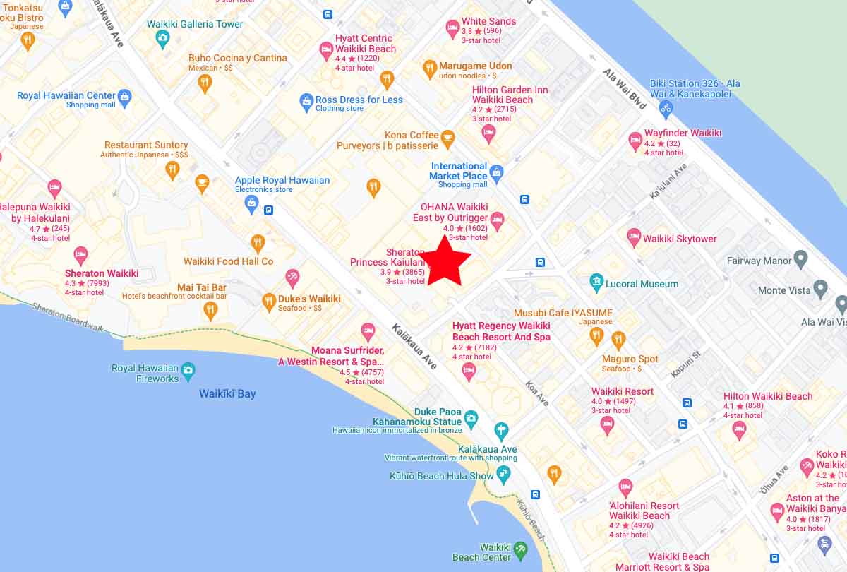 The Princess Kaiulani Hotel is located on Ka’iulani Ave between Kalakaua Ave and Kuhio Ave in Waikiki. The location is excellent IMHO, as it’s right in the middle of everything. Unfortunately, that’s the nicest thing I’ll have to say about my experience in this entire review.