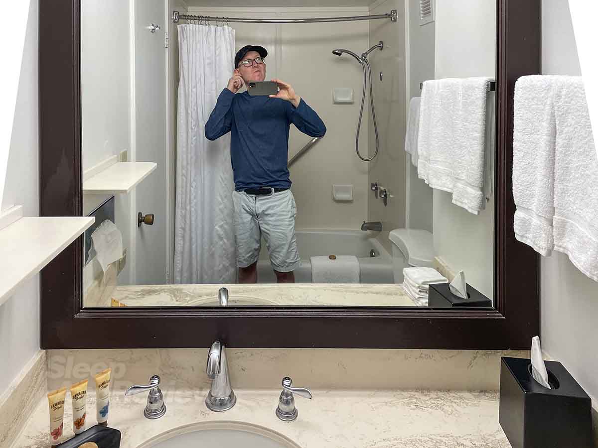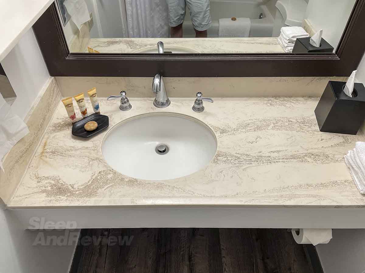The best way to describe the bathroom in my room at the Sheraton Princess Kaiulani is to say that it reminded me of a typical roadside motel bathroom. It was kind of dark, extremely beige, and very much not any better than the bathroom that I had in my room at the Waikiki Malia.