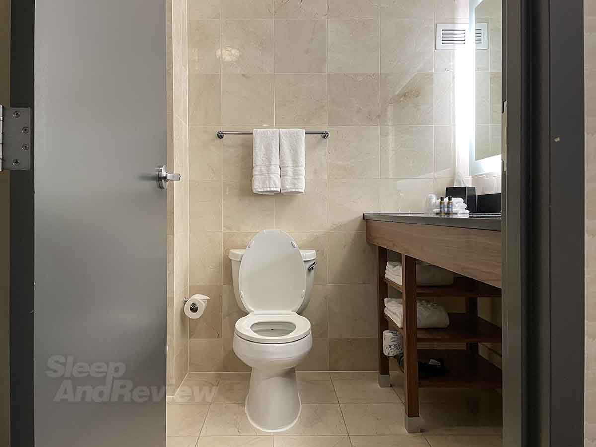 The bathroom vanity. It’s nice, but…the toilet is more inviting IMHO.